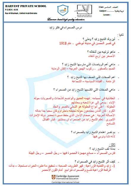 اوراق عمل الصحراء في فكر زايد في الدراسات الاجتماعية للصف السادس الفصل الثالث