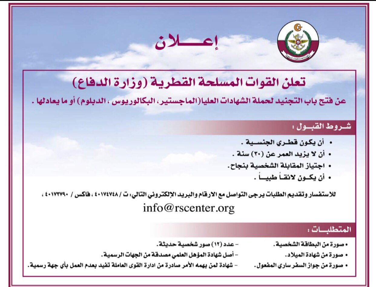 شبكة أهل قطر الأولى A Twitter القيادة العامة للقوات المسلحة القطرية أعلنت عن فتح باب التجنيد بالتوفيق