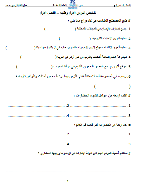 أوراق عمل في الدرس الأول الصف السادس اجتماعيات الفصل الأول 2020 2021 المناهج الإماراتية