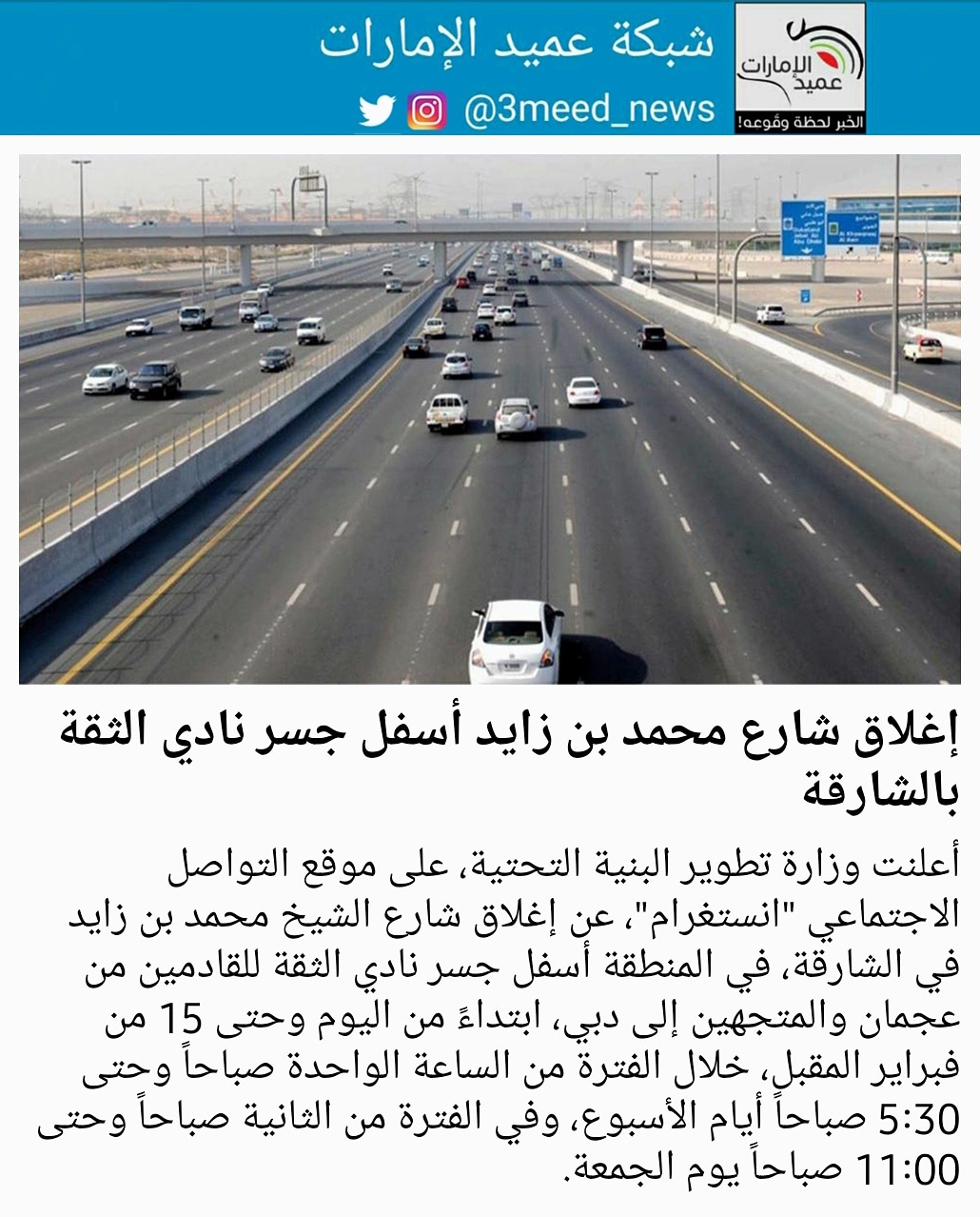 O Xrhsths شبكة عميد الإمارات Sto Twitter أعلنت وزارة تطوير البنية التحتية على موقع التواصل الاجتماعي انستغرام عن إغلاق شارع الشيخ محمد بن زايد في الشارقة في المنطقة أسفل جسر نادي الثقة