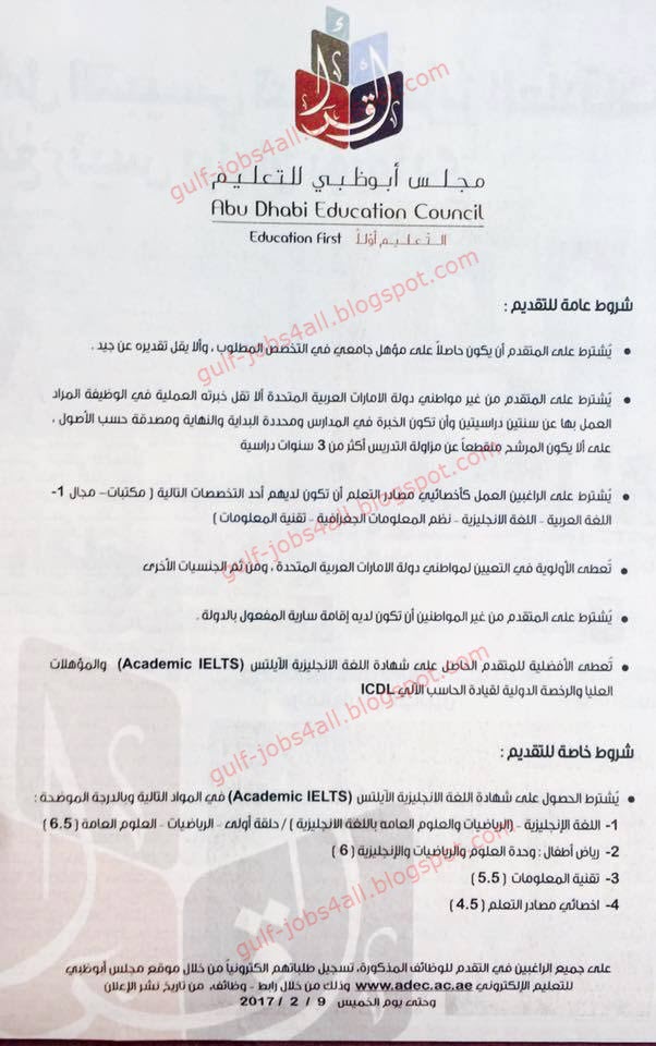مجلس ابو ظبى للتعليم اعلان وظائف مجلس ابوظبي للتعليم للعام الدراسي 2017 2018 مطلوب معلمين ومعلمات واخصائيين جميع التخصصات والتقديم الكتروني Abu Dhab Education Council Adec Jobs Teachers
