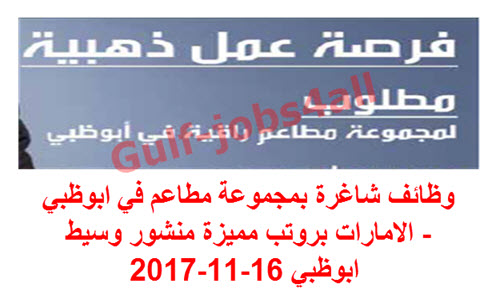وظائف شاغرة بمجموعة مطاعم في ابوظبي الامارات بروتب مميزة منشور وسيط ابوظبي 16 11 2017