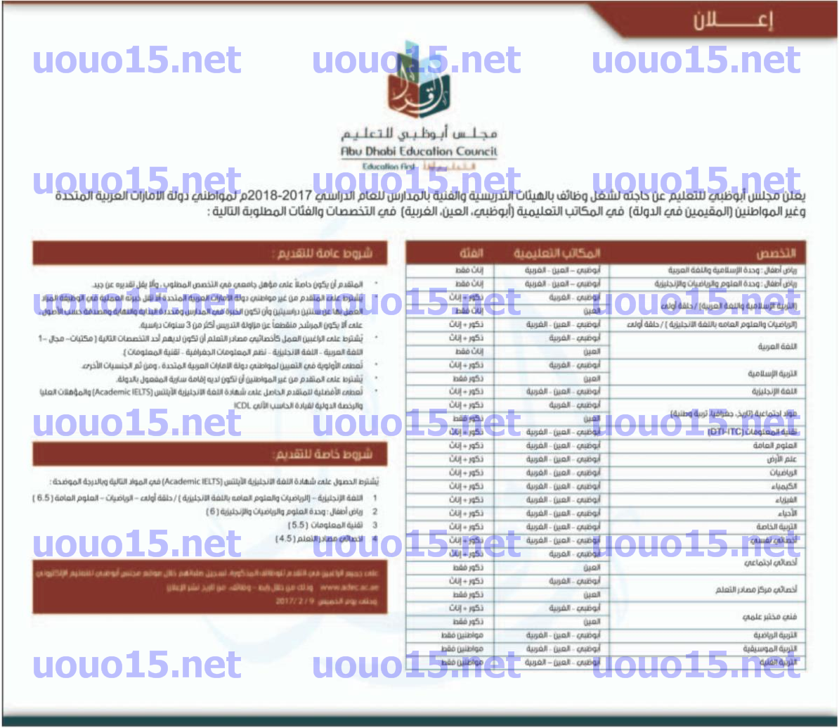 اعلان وظائف مجلس ابوظبي للتعليم للعام الدراسي 2017 2018 مطلوب مدرسين ومدرسات ج التخصصات والتقديم حتى 9 2 2017
