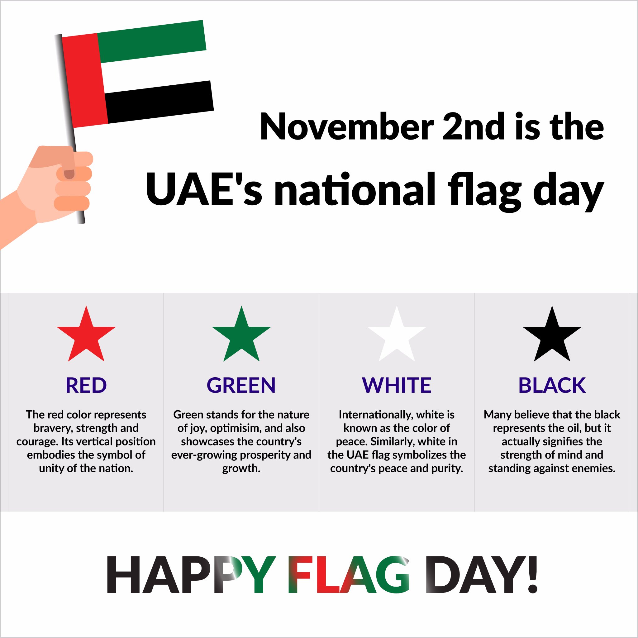 Driven Properties On Twitter Do You Know The Meaning Of The Uae S Flag Colors We Wish Everyone In The Uae A Very Happy Flag Day Uaeflagday Mydubai Uae يوم العلم Https T Co Tlfrpbp7os